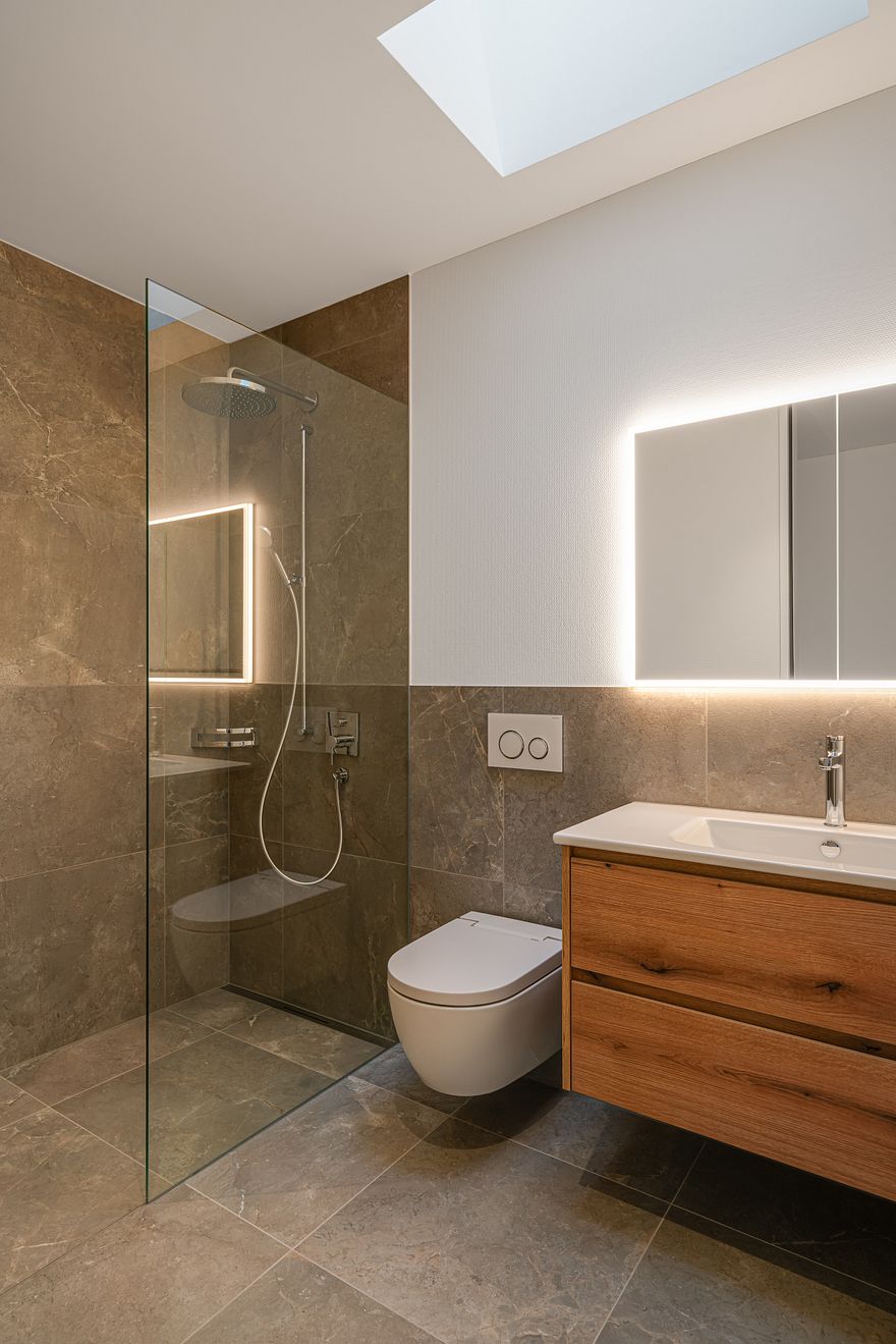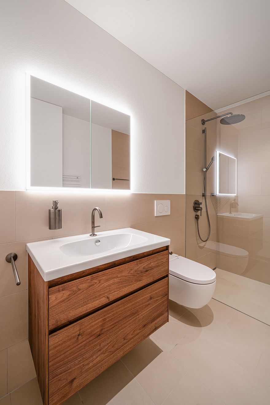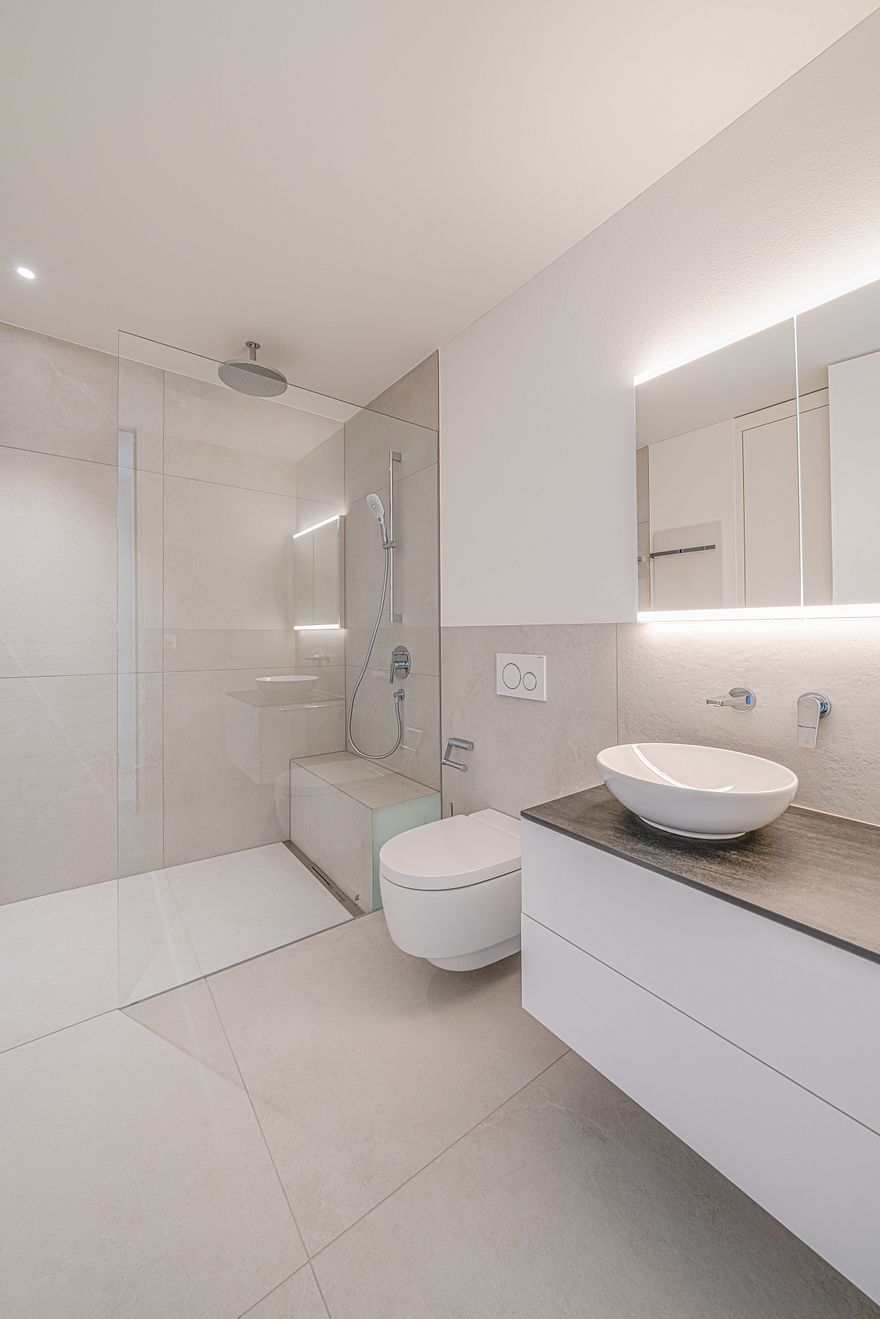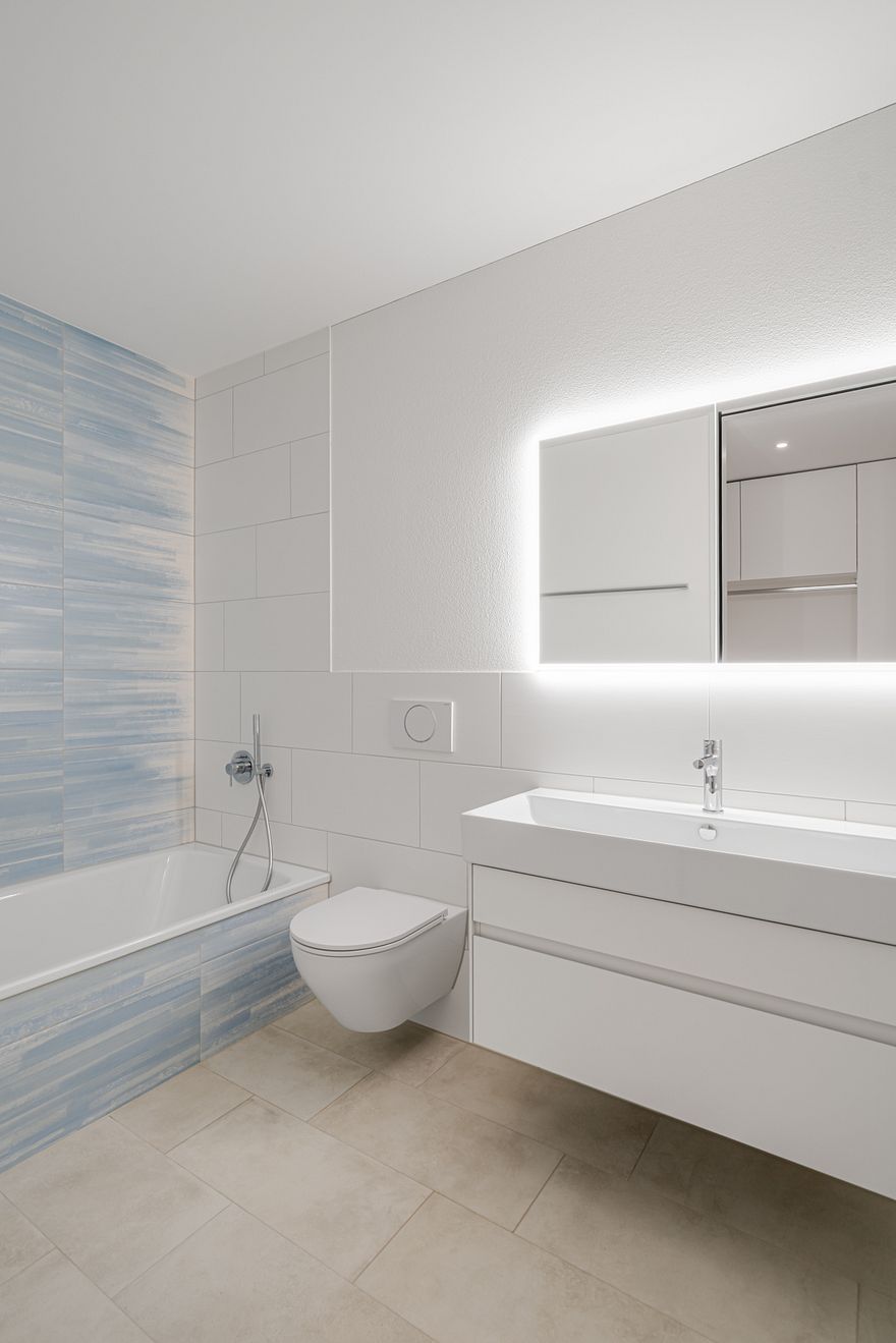 Die Heizung sowie die Warmwasseraufbereitung erfolgen über eine effiziente und umweltfreundliche Fernwärme, ausgeführt durch die Arnold AG Heizung-Sanitär. Zudem überzeugen die Badezimmer durch einen hohen Ausbaustandard mit Unterputz-Armaturen und Unterputz-Spiegelschränken sowie hochwertigen Sanitäranlagen und edlen Materialien.